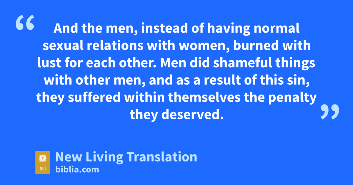 24 So God abandoned them to do whatever shameful things their hearts desired. As a result, they did vile and degrading things with each other’s bodies. 25 They traded the truth about God for a lie. So they worshiped and served the things God created instead of the Creator himself, who is worthy of eternal praise! Amen. 26 That is why God abandoned them to their shameful desires. Even the women turned against the natural way to have sex and instead indulged in sex with each other. 27 And the men, instead of having normal sexual relations with women, burned with lust for each other. Men did shameful things with other men, and as a result of this sin, they suffered within themselves the penalty they deserved.