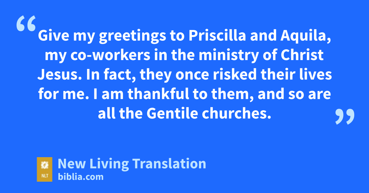 3 Give my greetings to Priscilla and Aquila, my co-workers in the ministry of Christ Jesus. 4 In fact, they once risked their lives for me. I am thankful to them, and so are all the Gentile churches. 5 Also give my greetings to the church that meets in their home.