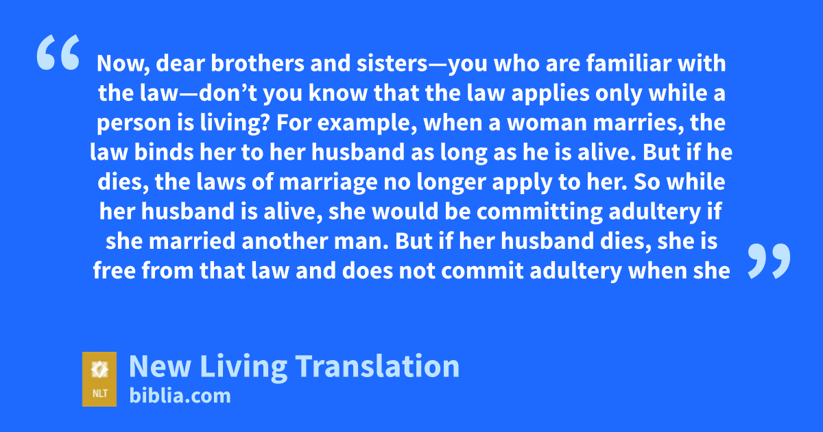 Now, dear brothers and sisters* —you who are familiar with the law—don’t you know that the law applies only while a person is living? 2 For example, when a woman marries, the law binds her to her husband as long as he is alive. But if he dies, the laws of marriage no longer apply to her. 3 So while her husband is alive, she would be committing adultery if she married another man. But if her husband dies, she is free from that law and does not commit adultery when she remarries.