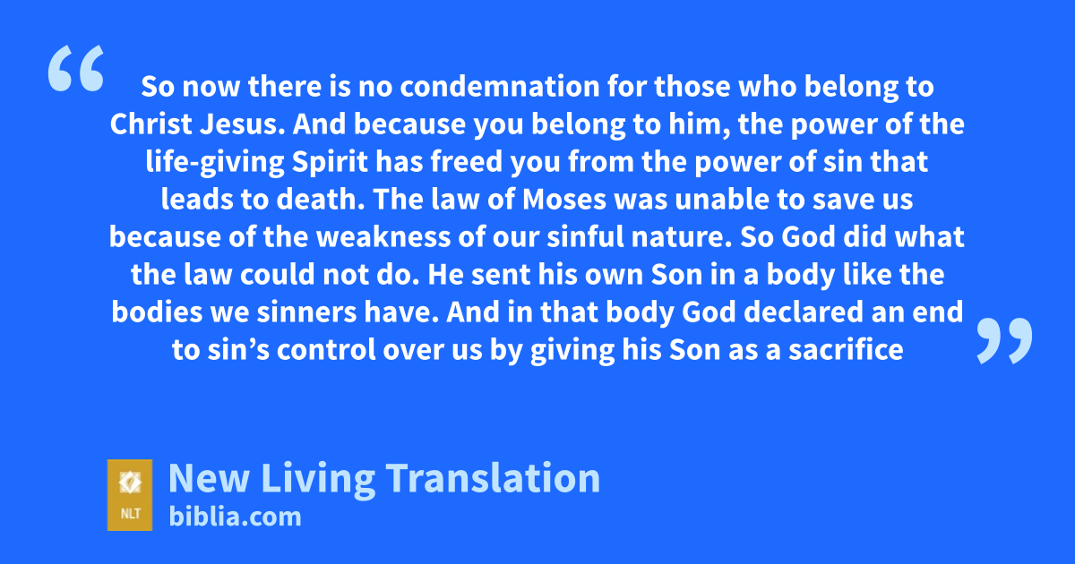 So now there is no condemnation for those who belong to Christ Jesus. 2 And because you belong to him, the power* of the life-giving Spirit has freed you* from the power of sin that leads to death. 3 The law of Moses was unable to save us because of the weakness of our sinful nature.* So God did what the law could not do. He sent his own Son in a body like the bodies we sinners have. And in that body God declared an end to sin’s control over us by giving his Son as a sacrifice for our sins. 4 He did this so that the just requirement of the law would be fully satisfied for us, who no longer follow our sinful nature but instead follow the Spirit.
