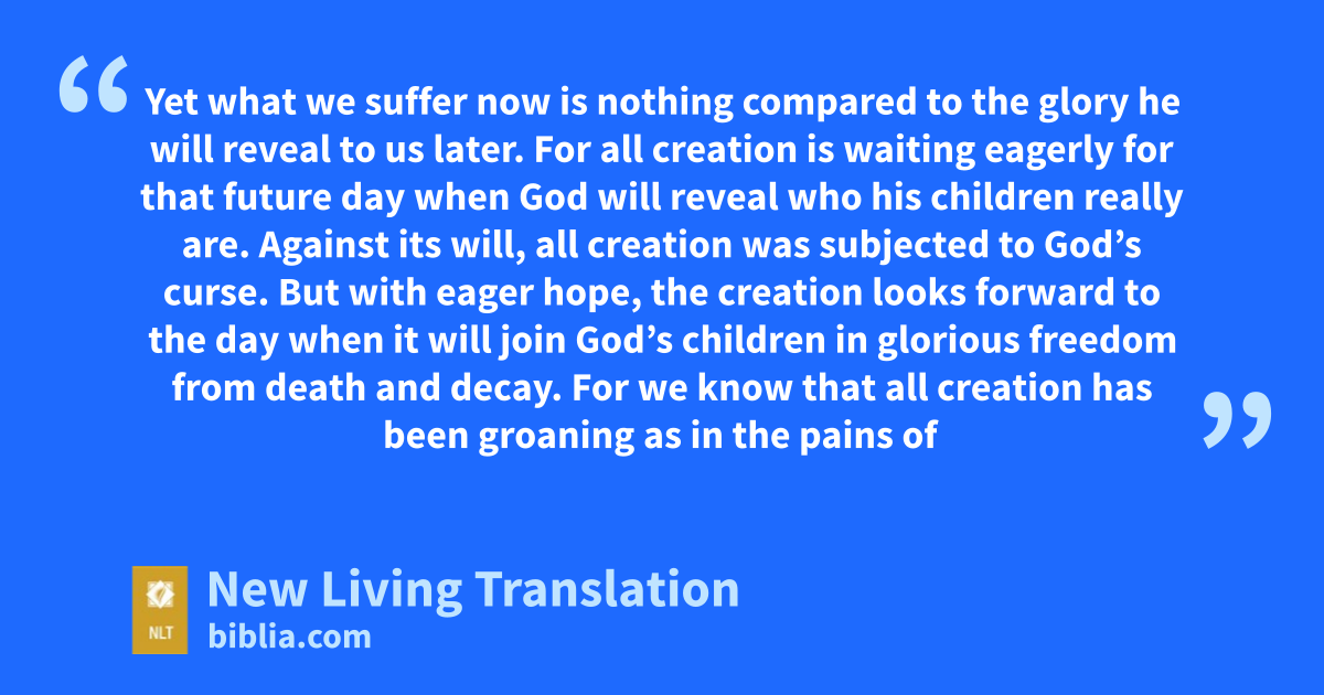 18 Yet what we suffer now is nothing compared to the glory he will reveal to us later. 19 For all creation is waiting eagerly for that future day when God will reveal who his children really are. 20 Against its will, all creation was subjected to God’s curse. But with eager hope, 21 the creation looks forward to the day when it will join God’s children in glorious freedom from death and decay. 22 For we know that all creation has been groaning as in the pains of childbirth right up to the present time. 23 And we believers also groan, even though we have the Holy Spirit within us as a foretaste of future glory, for we long for our bodies to be released from sin and suffering. We, too, wait with eager hope for the day when God will give us our full rights as his adopted children,* including the new bodies he has promised us. 24 We were given this hope when we were saved. (If we already have something, we don’t need to hope* for it. 25 But if we look forward to something we don’t yet have, we must wait patiently and confidently.)