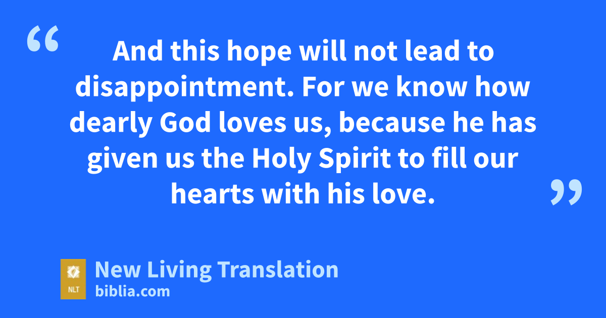 3 We can rejoice, too, when we run into problems and trials, for we know that they help us develop endurance. 4 And endurance develops strength of character, and character strengthens our confident hope of salvation. 5 And this hope will not lead to disappointment. For we know how dearly God loves us, because he has given us the Holy Spirit to fill our hearts with his love.