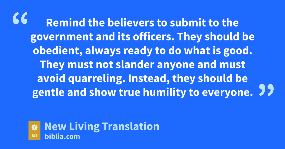 Remind the believers to submit to the government and its officers. They should be obedient, always ready to do what is good. 2 They must not slander anyone and must avoid quarreling. Instead, they should be gentle and show true humility to everyone.