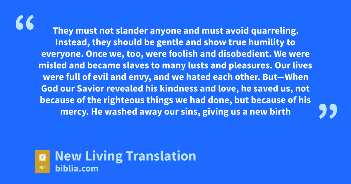 4 But—When God our Savior revealed his kindness and love, 5 he saved us, not because of the righteous things we had done, but because of his mercy. He washed away our sins, giving us a new birth and new life through the Holy Spirit.* 6 He generously poured out the Spirit upon us through Jesus Christ our Savior. 7 Because of his grace he made us right in his sight and gave us confidence that we will inherit eternal life. 8 This is a trustworthy saying, and I want you to insist on these teachings so that all who trust in God will devote themselves to doing good. These teachings are good and beneficial for everyone.