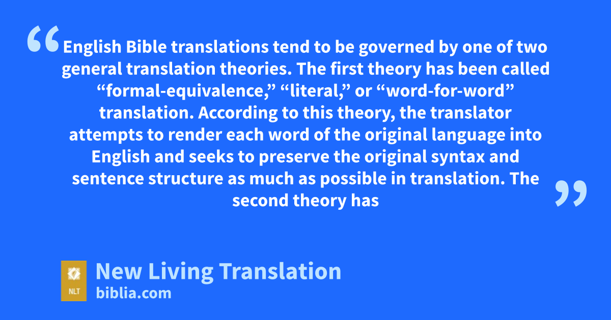 English Bible translations tend to be governed by one of two general translation theories. The first theory has been called “formal-equivalence,” “literal,” or “word-for-word” translation. According to this theory, the translator attempts to render each word of the original language into English and seeks to preserve the original syntax and sentence structure as much as possible in translation. The second theory has been called “dynamic-equivalence,” “functional-equivalence,” or “thought-for-thought” translation. The goal of this translation theory is to produce in English the closest natural equivalent of the message expressed by the original-language text, both in meaning and in style.