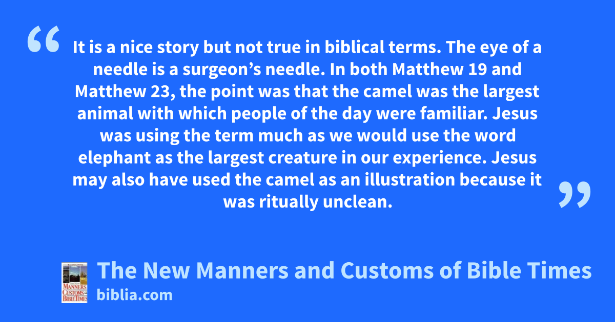 It is a nice story but not true in biblical terms. The eye of a needle is a surgeon’s needle. In both Matthew 19 and Matthew 23, the point was that the camel was the largest animal with which people of the day were familiar. Jesus was using the term much as we would use the word elephant as the largest creature in our experience. Jesus may also have used the camel as an illustration because it was ritually unclean.
