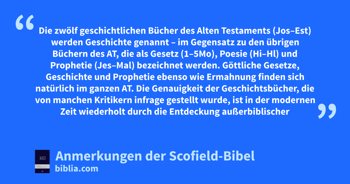 Die zwölf geschichtlichen Bücher des Alten Testaments (Jos–Est) werden Geschichte genannt – im Gegensatz zu den übrigen Büchern des AT, die als Gesetz (1–5Mo), Poesie (Hi–Hl) und Prophetie (Jes–Mal) bezeichnet werden. Göttliche Gesetze, Geschichte und Prophetie ebenso wie Ermahnung finden sich natürlich im ganzen AT. Die Genauigkeit der Geschichtsbücher, die von manchen Kritikern infrage gestellt wurde, ist in der modernen Zeit wiederholt durch die Entdeckung außerbiblischer Belege bestätigt worden.