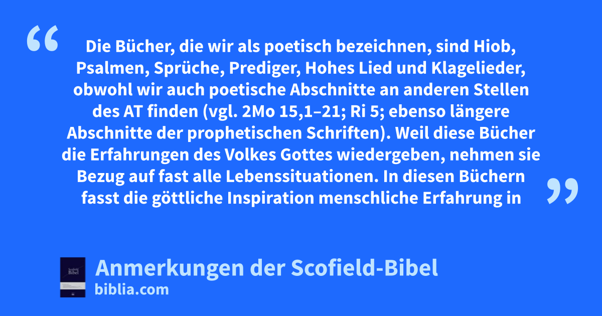 Die Bücher, die wir als poetisch bezeichnen, sind Hiob, Psalmen, Sprüche, Prediger, Hohes Lied und Klagelieder, obwohl wir auch poetische Abschnitte an anderen Stellen des AT finden (vgl. 2Mo 15,1–21; Ri 5; ebenso längere Abschnitte der prophetischen Schriften). Weil diese Bücher die Erfahrungen des Volkes Gottes wiedergeben, nehmen sie Bezug auf fast alle Lebenssituationen. In diesen Büchern fasst die göttliche Inspiration menschliche Erfahrung in eine allgemeine Wahrheit, die zahllosen Gläubigen zu allen Zeiten Trost, Kraft und Wegweisung gegeben hat.