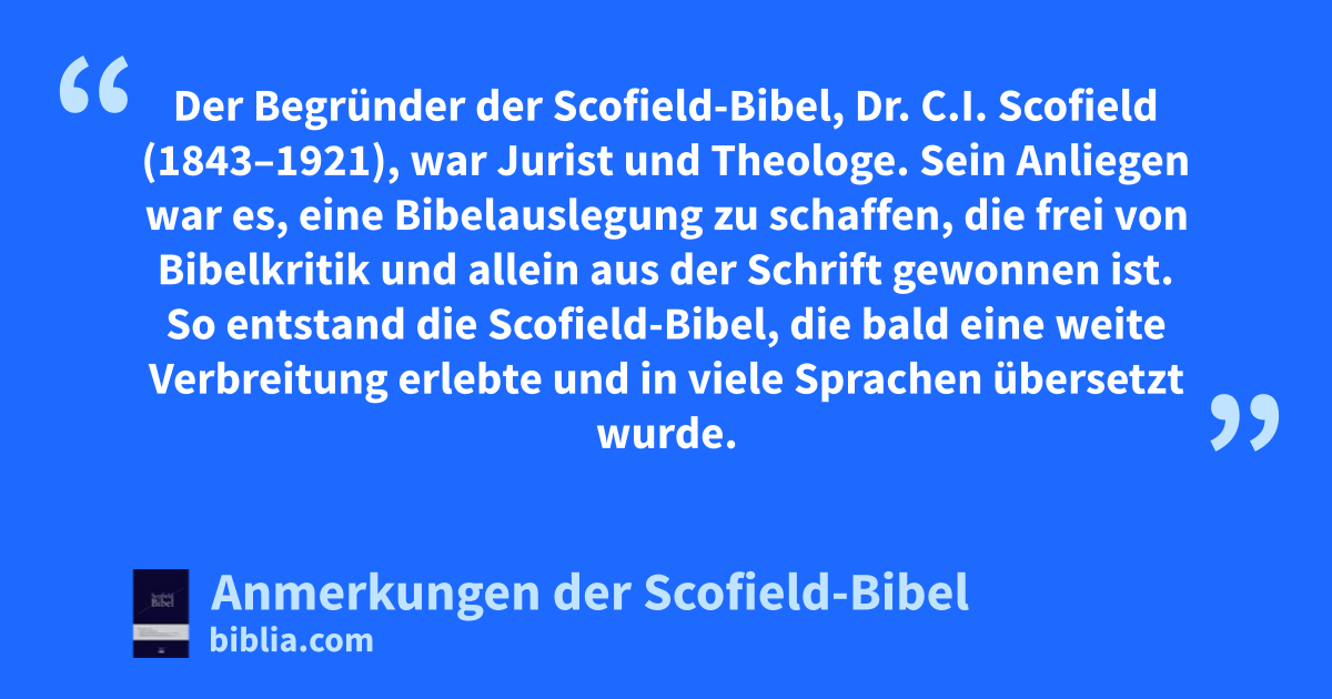 Der Begründer der Scofield-Bibel, Dr. C.I. Scofield (1843–1921), war Jurist und Theologe. Sein Anliegen war es, eine Bibelauslegung zu schaffen, die frei von Bibelkritik und allein aus der Schrift gewonnen ist. So entstand die Scofield-Bibel, die bald eine weite Verbreitung erlebte und in viele Sprachen übersetzt wurde.
