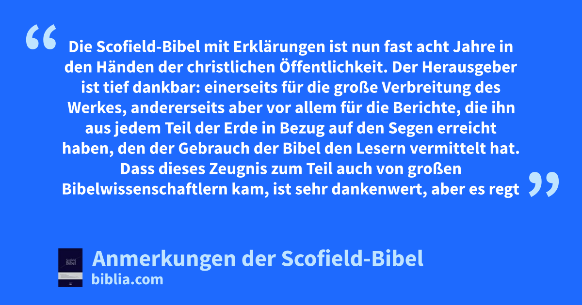 Die Scofield-Bibel mit Erklärungen ist nun fast acht Jahre in den Händen der christlichen Öffentlichkeit. Der Herausgeber ist tief dankbar: einerseits für die große Verbreitung des Werkes, andererseits aber vor allem für die Berichte, die ihn aus jedem Teil der Erde in Bezug auf den Segen erreicht haben, den der Gebrauch der Bibel den Lesern vermittelt hat.