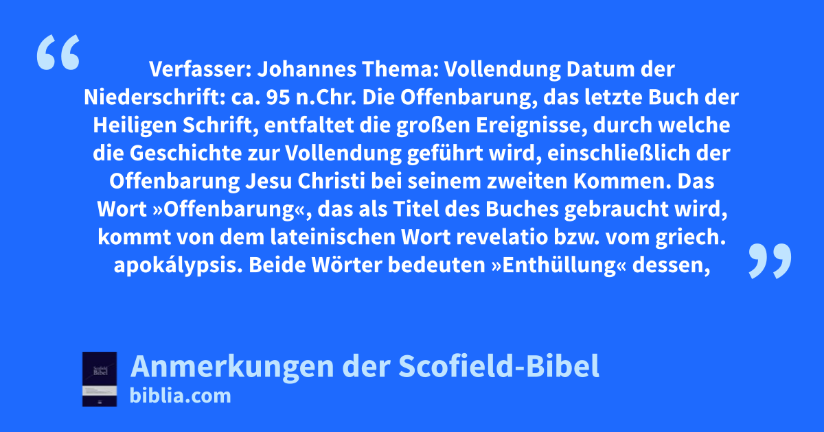 Die Offenbarung, das letzte Buch der Heiligen Schrift, entfaltet die großen Ereignisse, durch welche die Geschichte zur Vollendung geführt wird, einschließlich der Offenbarung Jesu Christi bei seinem zweiten Kommen. Das Wort »Offenbarung«, das als Titel des Buches gebraucht wird, kommt von dem lateinischen Wort revelatio bzw. vom griech. apokálypsis. Beide Wörter bedeuten »Enthüllung« dessen, was zuvor verborgen oder unbekannt war.