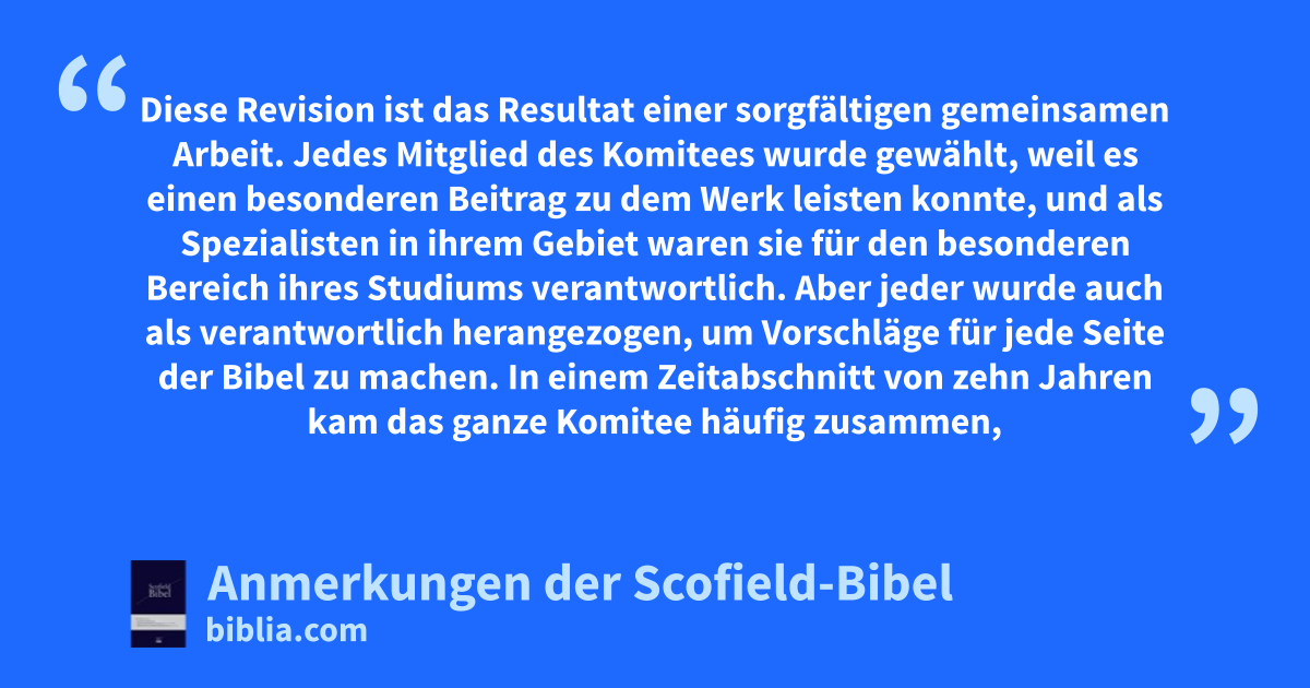Dies ist eine geeignete Gelegenheit, dem Leser zu versichern, dass – genauso wie Dr. Scofield und seine Mitarbeiter bei dem ursprünglichen Werk – auch jedes Mitglied des Komitees der Revision die vollständige Inspiration und Unfehlbarkeit der Heiligen Schriften glaubt und lehrt; dass jedes Mitglied an die dreieinige Gottheit glaubt, die in Vater, Sohn und Heiligem Geist besteht; an die Jungfrauengeburt und die Gottheit Christi; an die Notwendigkeit und die Gültigkeit seines Versöhnungswerkes; an die leibliche Auferstehung und Himmelfahrt Christi; an sein bevorstehendes Kommen für seine Gemeinde und sein sichtbares Wiederkommen auf die Erde vor dem Tausendjährigen Reich; an die ewige Seligkeit der Erlösten und die ewige Strafe der Verlorenen. Um die Probleme der Bibelkritik wissend hält das Komitee dennoch unerschütterlich an der Autorität des unfehlbaren Wortes Gottes in Bezug auf Glauben und Leben fest.