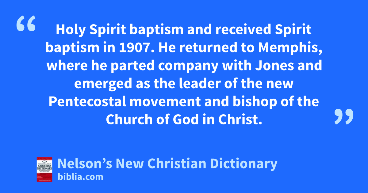 Holy Spirit baptism and received Spirit baptism in 1907. He returned to Memphis, where he parted company with Jones and emerged as the leader of the new Pentecostal movement and bishop of the Church of God in Christ.