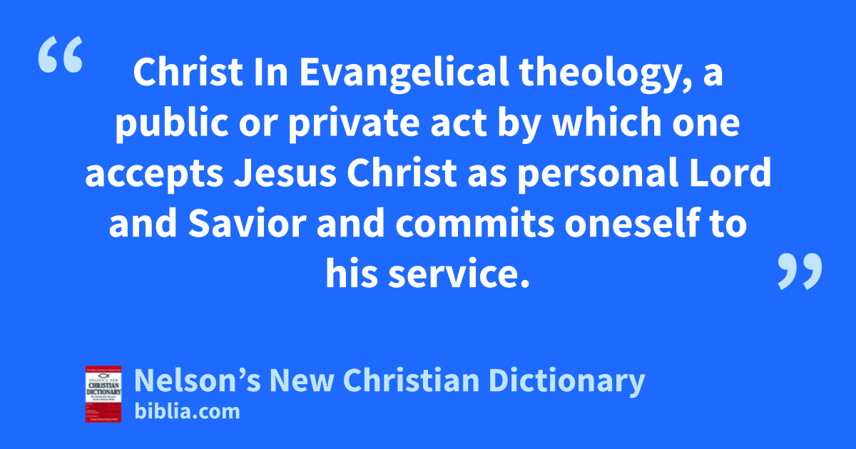 Christ In Evangelical theology, a public or private act by which one accepts Jesus Christ as personal Lord and Savior and commits oneself to his service.
