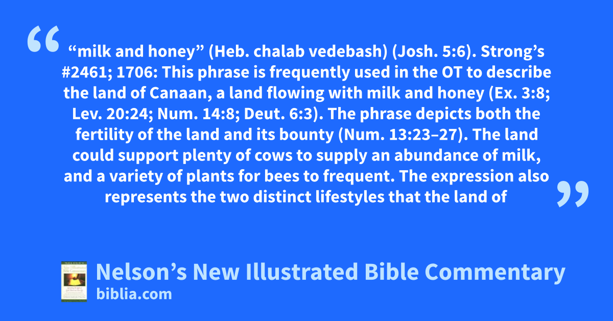 “milk and honey” (Heb. chalab vedebash) (Josh. 5:6). Strong’s #2461; 1706: This phrase is frequently used in the OT to describe the land of Canaan, a land flowing with milk and honey (Ex. 3:8; Lev. 20:24; Num. 14:8; Deut. 6:3). The phrase depicts both the fertility of the land and its bounty (Num. 13:23–27). The land could support plenty of cows to supply an abundance of milk, and a variety of plants for bees to frequent. The expression also represents the two distinct lifestyles that the land of