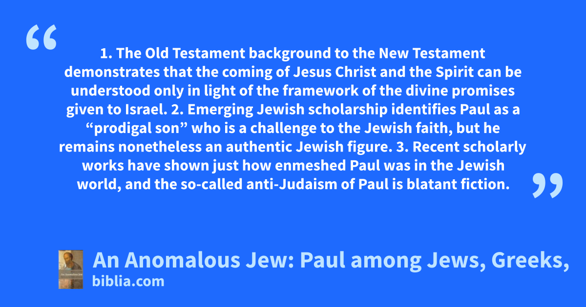 1. The Old Testament background to the New Testament demonstrates that the coming of Jesus Christ and the Spirit can be understood only in light of the framework of the divine promises given to Israel. 2. Emerging Jewish scholarship identifies Paul as a “prodigal son” who is a challenge to the Jewish faith, but he remains nonetheless an authentic Jewish figure. 3. Recent scholarly works have shown just how enmeshed Paul was in the Jewish world, and the so-called anti-Judaism of Paul is blatant fiction.