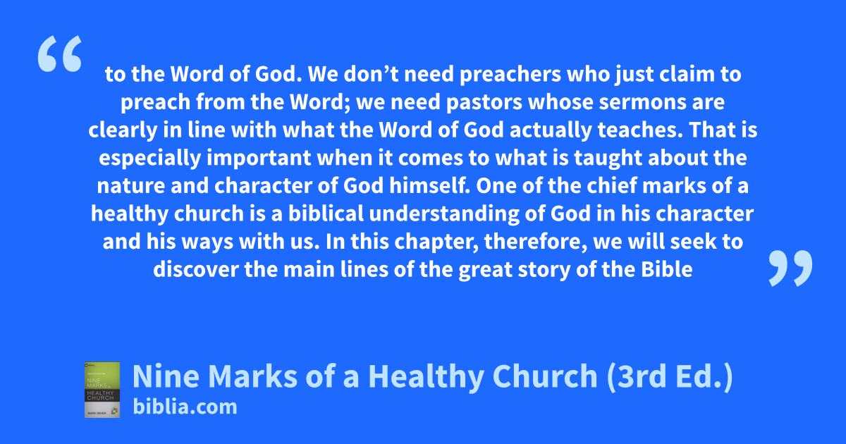 to the Word of God. We don’t need preachers who just claim to preach from the Word; we need pastors whose sermons are clearly in line with what the Word of God actually teaches. That is especially important when it comes to what is taught about the nature and character of God himself. One of the chief marks of a healthy church is a biblical understanding of God in his character and his ways with us. In this chapter, therefore, we will seek to discover the main lines of the great story of the Bible