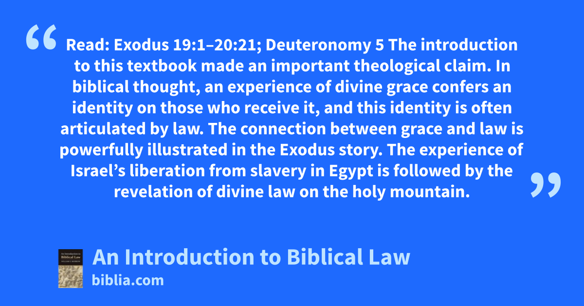 Read: Exodus 19:1–20:21; Deuteronomy 5 The introduction to this textbook made an important theological claim. In biblical thought, an experience of divine grace confers an identity on those who receive it, and this identity is often articulated by law. The connection between grace and law is powerfully illustrated in the Exodus story. The experience of Israel’s liberation from slavery in Egypt is followed by the revelation of divine law on the holy mountain.