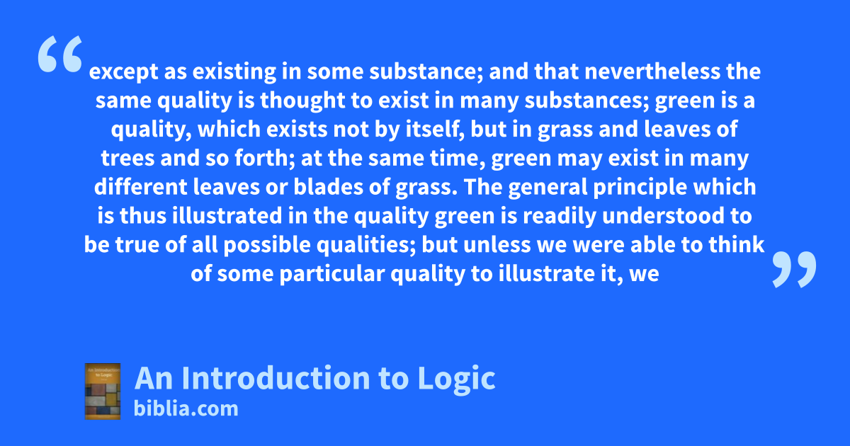 except as existing in some substance; and that nevertheless the same quality is thought to exist in many substances; green is a quality, which exists not by itself, but in grass and leaves of trees and so forth; at the same time, green may exist in many different leaves or blades of grass. The general principle which is thus illustrated in the quality green is readily understood to be true of all possible qualities; but unless we were able to think of some particular quality to illustrate it, we