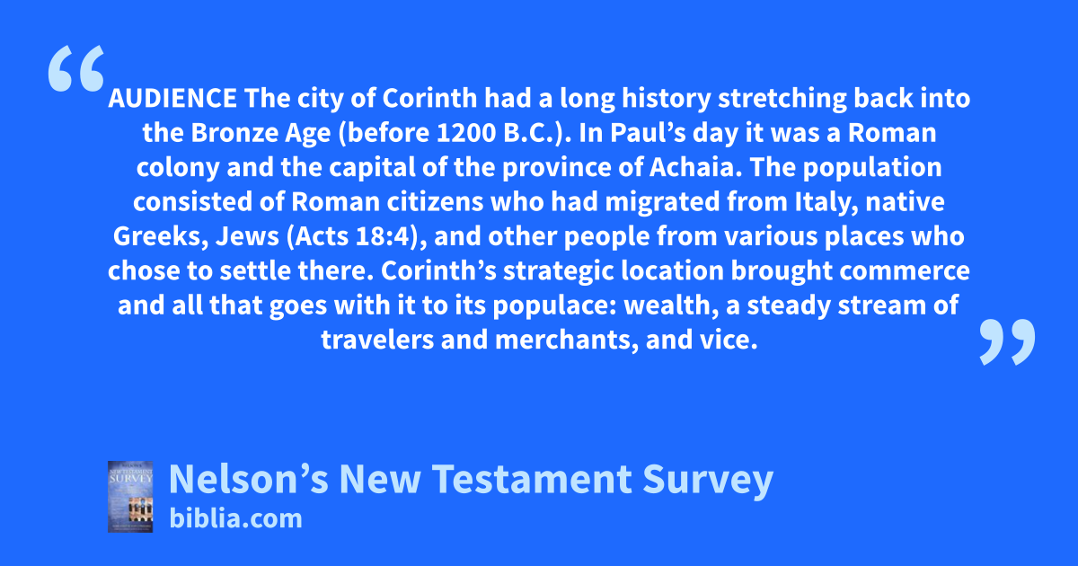 AUDIENCE The city of Corinth had a long history stretching back into the Bronze Age (before 1200 B.C.). In Paul’s day it was a Roman colony and the capital of the province of Achaia. The population consisted of Roman citizens who had migrated from Italy, native Greeks, Jews (Acts 18:4), and other people from various places who chose to settle there. Corinth’s strategic location brought commerce and all that goes with it to its populace: wealth, a steady stream of travelers and merchants, and vice.