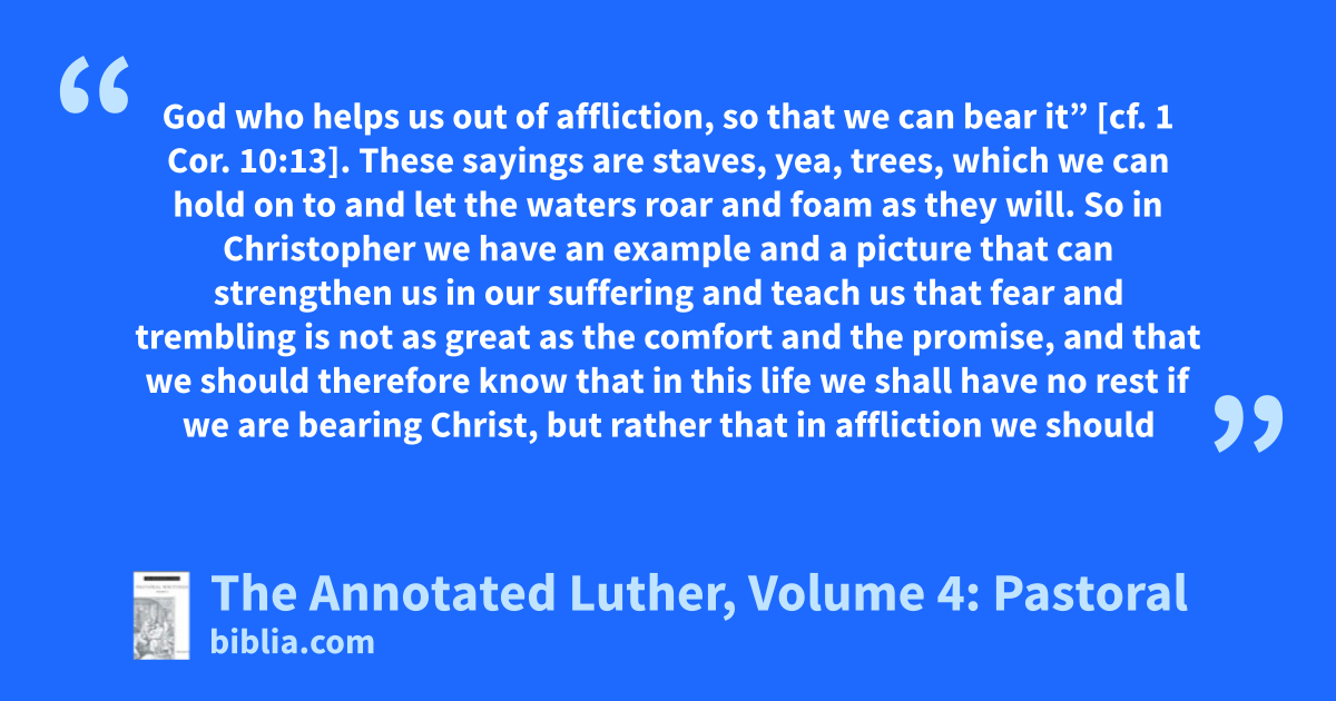 God who helps us out of affliction, so that we can bear it” [cf. 1 Cor. 10:13]. These sayings are staves, yea, trees, which we can hold on to and let the waters roar and foam as they will. So in Christopher we have an example and a picture that can strengthen us in our suffering and teach us that fear and trembling is not as great as the comfort and the promise, and that we should therefore know that in this life we shall have no rest if we are bearing Christ, but rather that in affliction we should