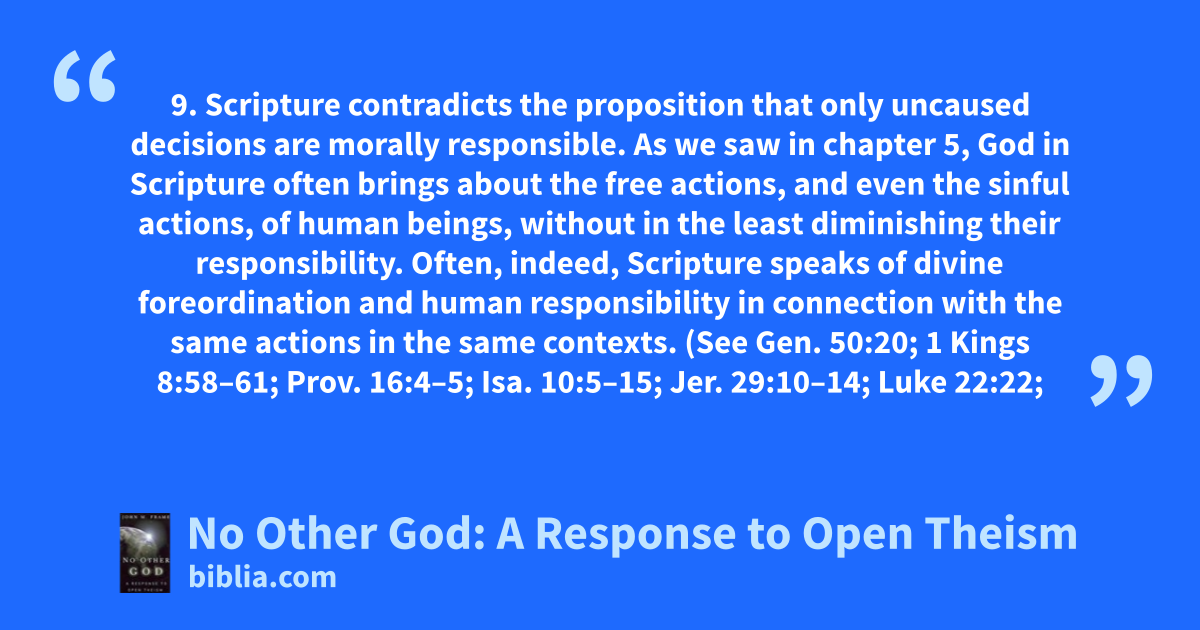 9. Scripture contradicts the proposition that only uncaused decisions are morally responsible. As we saw in chapter 5, God in Scripture often brings about the free actions, and even the sinful actions, of human beings, without in the least diminishing their responsibility. Often, indeed, Scripture speaks of divine foreordination and human responsibility in connection with the same actions in the same contexts. (See Gen. 50:20; 1 Kings 8:58–61; Prov. 16:4–5; Isa. 10:5–15; Jer. 29:10–14; Luke 22:22;