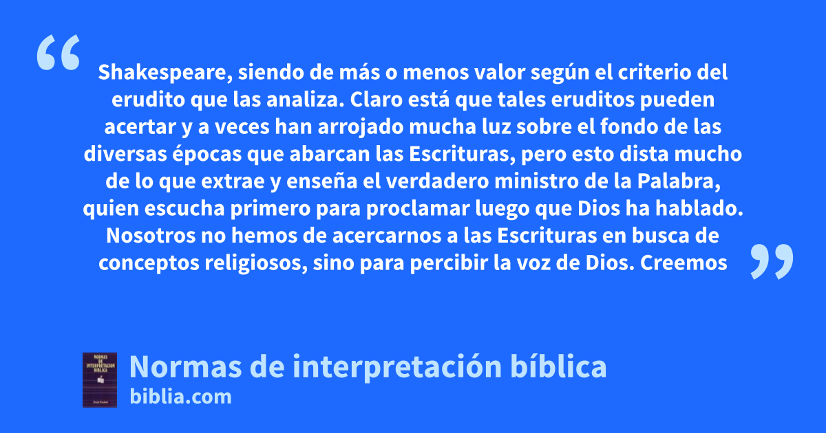 Shakespeare, siendo de más o menos valor según el criterio del erudito que las analiza. Claro está que tales eruditos pueden acertar y a veces han arrojado mucha luz sobre el fondo de las diversas épocas que abarcan las Escrituras, pero esto dista mucho de lo que extrae y enseña el verdadero ministro de la Palabra, quien escucha primero para proclamar luego que Dios ha hablado. Nosotros no hemos de acercarnos a las Escrituras en busca de conceptos religiosos, sino para percibir la voz de Dios. Creemos