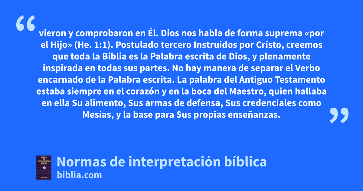 vieron y comprobaron en Él. Dios nos habla de forma suprema «por el Hijo» (He. 1:1). Postulado tercero Instruidos por Cristo, creemos que toda la Biblia es la Palabra escrita de Dios, y plenamente inspirada en todas sus partes. No hay manera de separar el Verbo encarnado de la Palabra escrita. La palabra del Antiguo Testamento estaba siempre en el corazón y en la boca del Maestro, quien hallaba en ella Su alimento, Sus armas de defensa, Sus credenciales como Mesías, y la base para Sus propias enseñanzas.