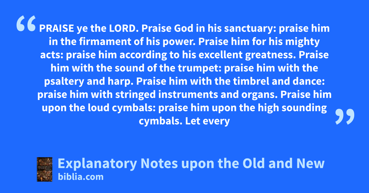 PRAISE ye the LORD. Praise God in his sanctuary: praise him in the firmament of his power. Praise him for his mighty acts: praise him according to his excellent greatness. Praise him with the sound of the trumpet: praise him with the psaltery and harp. Praise him with the timbrel and dance: praise him with stringed instruments and organs. Praise him upon the loud cymbals: praise him upon the high sounding cymbals. Let every