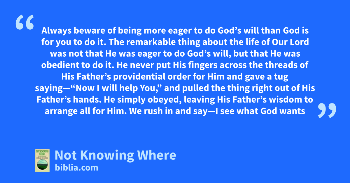 Always beware of being more eager to do God’s will than God is for you to do it. The remarkable thing about the life of Our Lord was not that He was eager to do God’s will, but that He was obedient to do it. He never put His fingers across the threads of His Father’s providential order for Him and gave a tug saying—“Now I will help You,” and pulled the thing right out of His Father’s hands. He simply obeyed, leaving His Father’s wisdom to arrange all for Him. We rush in and say—I see what God wants