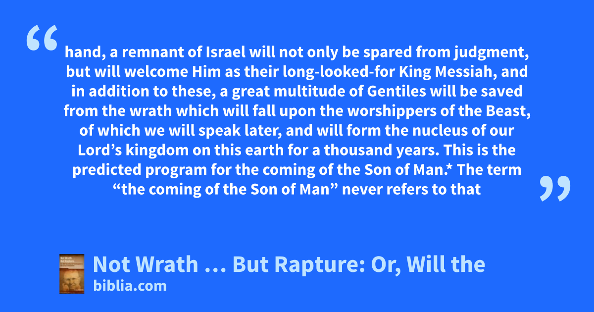 hand, a remnant of Israel will not only be spared from judgment, but will welcome Him as their long-looked-for King Messiah, and in addition to these, a great multitude of Gentiles will be saved from the wrath which will fall upon the worshippers of the Beast, of which we will speak later, and will form the nucleus of our Lord’s kingdom on this earth for a thousand years. This is the predicted program for the coming of the Son of Man.* The term “the coming of the Son of Man” never refers to that
