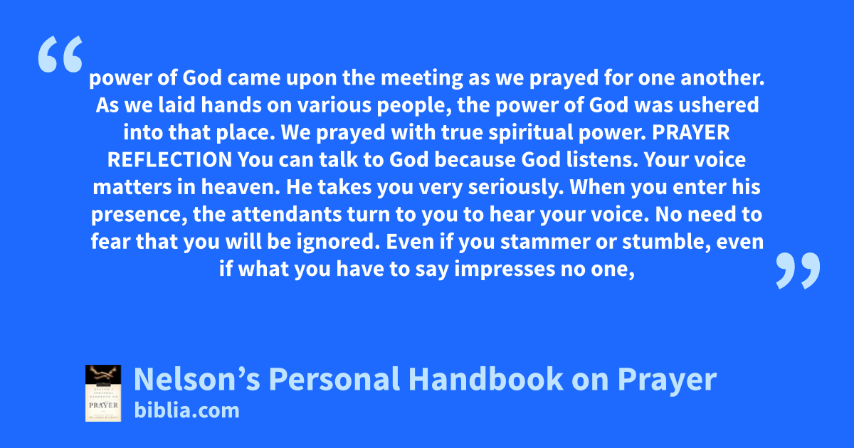 power of God came upon the meeting as we prayed for one another. As we laid hands on various people, the power of God was ushered into that place. We prayed with true spiritual power. PRAYER REFLECTION You can talk to God because God listens. Your voice matters in heaven. He takes you very seriously. When you enter his presence, the attendants turn to you to hear your voice. No need to fear that you will be ignored. Even if you stammer or stumble, even if what you have to say impresses no one,