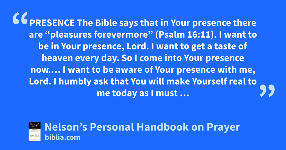 PRESENCE The Bible says that in Your presence there are “pleasures forevermore” (Psalm 16:11). I want to be in Your presence, Lord. I want to get a taste of heaven every day. So I come into Your presence now.… I want to be aware of Your presence with me, Lord. I humbly ask that You will make Yourself real to me today as I must …