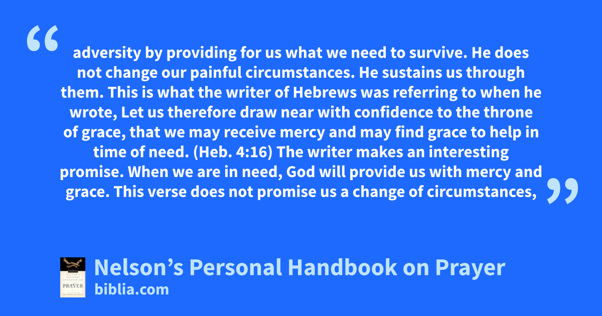 adversity by providing for us what we need to survive. He does not change our painful circumstances. He sustains us through them. This is what the writer of Hebrews was referring to when he wrote, Let us therefore draw near with confidence to the throne of grace, that we may receive mercy and may find grace to help in time of need. (Heb. 4:16) The writer makes an interesting promise. When we are in need, God will provide us with mercy and grace. This verse does not promise us a change of circumstances,