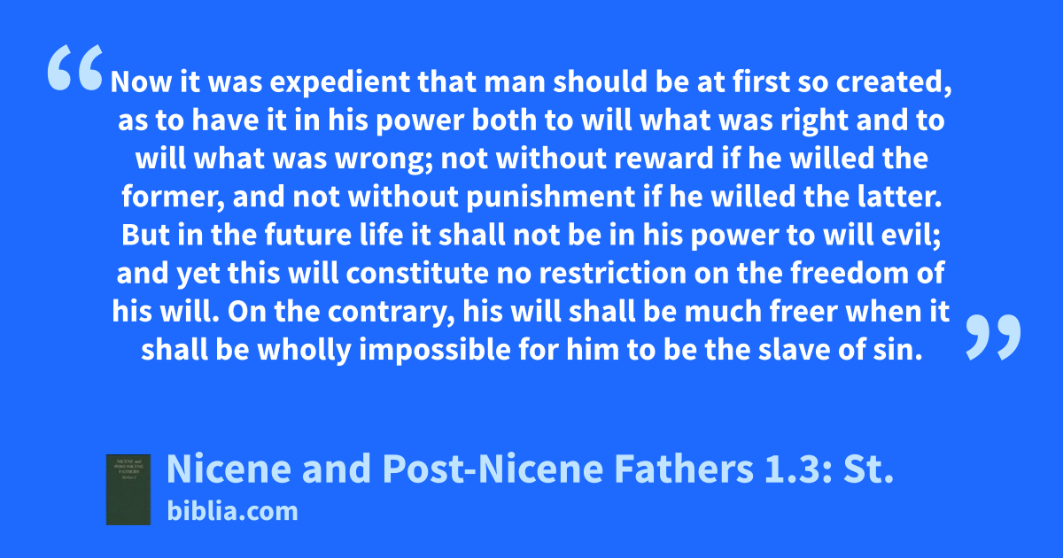 Now it was expedient that man should be at first so created, as to have it in his power both to will what was right and to will what was wrong; not without reward if he willed the former, and not without punishment if he willed the latter. But in the future life it shall not be in his power to will evil; and yet this will constitute no restriction on the freedom of his will. On the contrary, his will shall be much freer when it shall be wholly impossible for him to be the slave of sin.