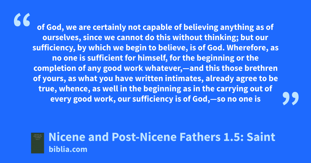 of God, we are certainly not capable of believing anything as of ourselves, since we cannot do this without thinking; but our sufficiency, by which we begin to believe, is of God. Wherefore, as no one is sufficient for himself, for the beginning or the completion of any good work whatever,—and this those brethren of yours, as what you have written intimates, already agree to be true, whence, as well in the beginning as in the carrying out of every good work, our sufficiency is of God,—so no one is