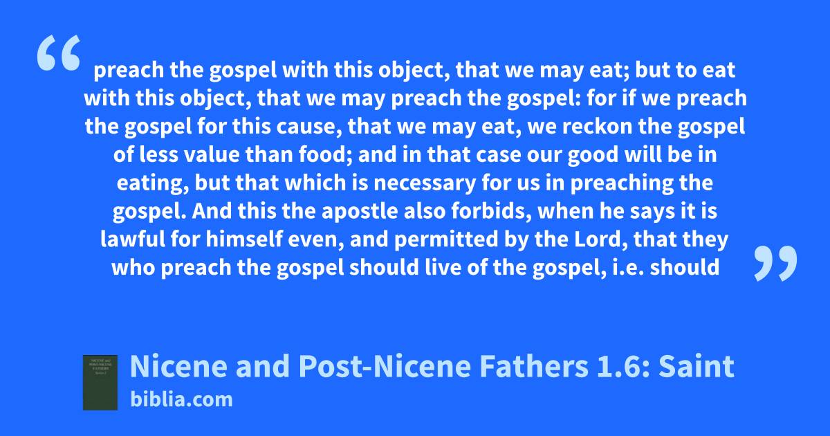 preach the gospel with this object, that we may eat; but to eat with this object, that we may preach the gospel: for if we preach the gospel for this cause, that we may eat, we reckon the gospel of less value than food; and in that case our good will be in eating, but that which is necessary for us in preaching the gospel. And this the apostle also forbids, when he says it is lawful for himself even, and permitted by the Lord, that they who preach the gospel should live of the gospel, i.e. should