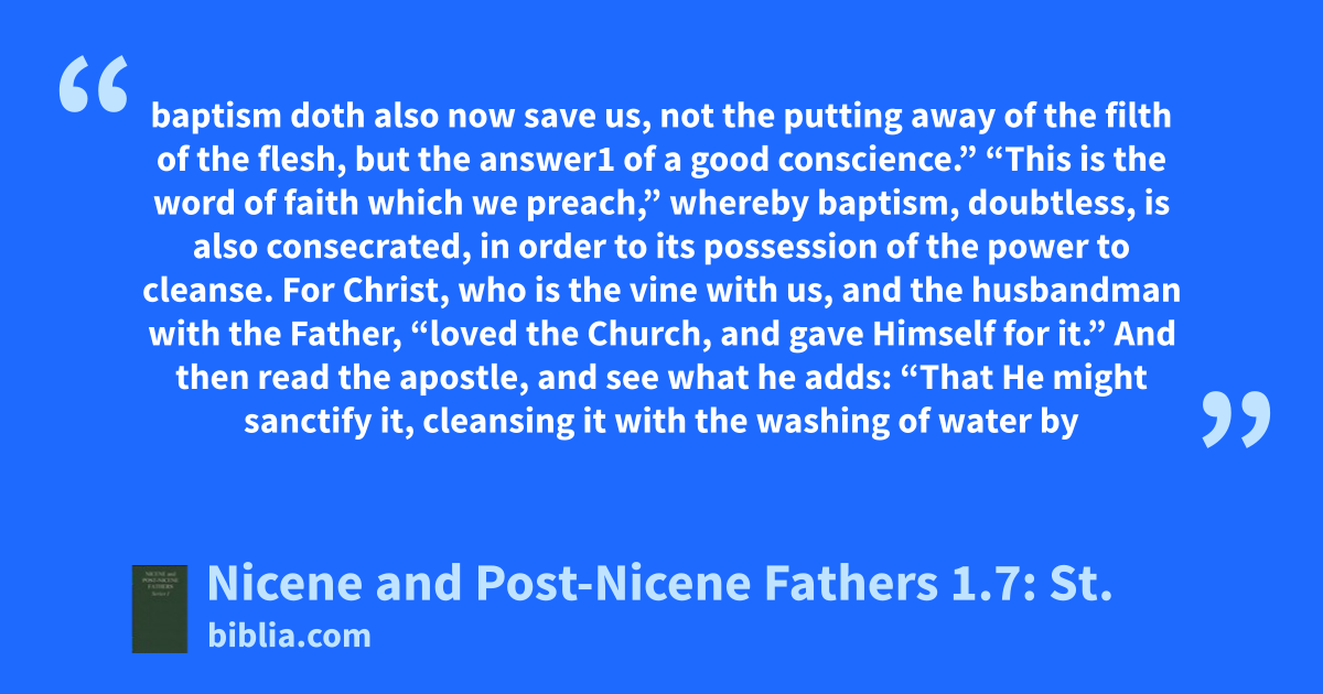 baptism doth also now save us, not the putting away of the filth of the flesh, but the answer1 of a good conscience.” “This is the word of faith which we preach,” whereby baptism, doubtless, is also consecrated, in order to its possession of the power to cleanse. For Christ, who is the vine with us, and the husbandman with the Father, “loved the Church, and gave Himself for it.” And then read the apostle, and see what he adds: “That He might sanctify it, cleansing it with the washing of water by