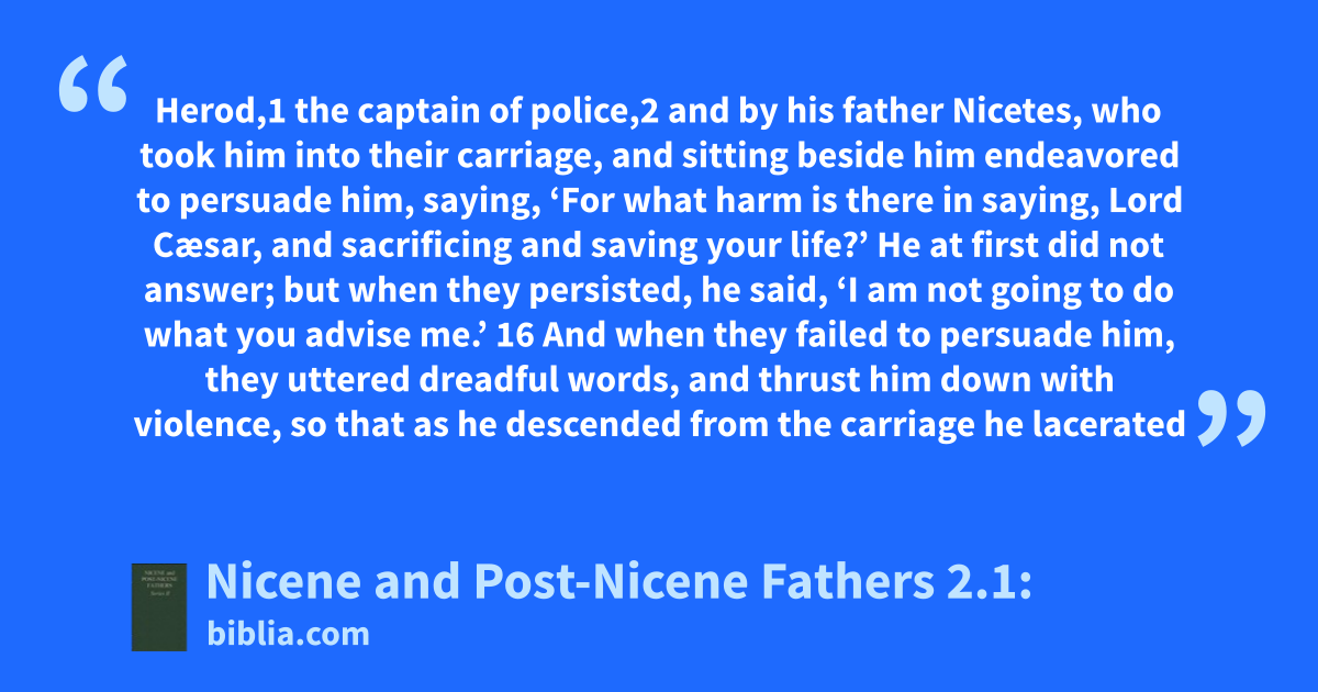 Herod,1 the captain of police,2 and by his father Nicetes, who took him into their carriage, and sitting beside him endeavored to persuade him, saying, ‘For what harm is there in saying, Lord Cæsar, and sacrificing and saving your life?’ He at first did not answer; but when they persisted, he said, ‘I am not going to do what you advise me.’ 16 And when they failed to persuade him, they uttered dreadful words, and thrust him down with violence, so that as he descended from the carriage he lacerated
