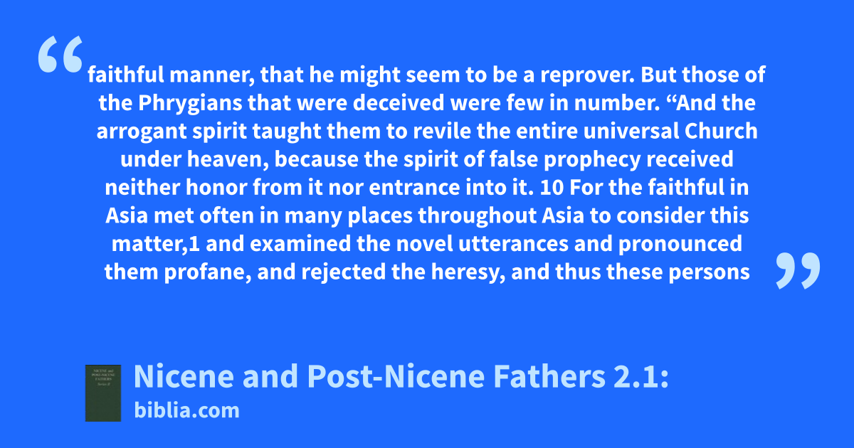 faithful manner, that he might seem to be a reprover. But those of the Phrygians that were deceived were few in number. “And the arrogant spirit taught them to revile the entire universal Church under heaven, because the spirit of false prophecy received neither honor from it nor entrance into it. 10 For the faithful in Asia met often in many places throughout Asia to consider this matter,1 and examined the novel utterances and pronounced them profane, and rejected the heresy, and thus these persons