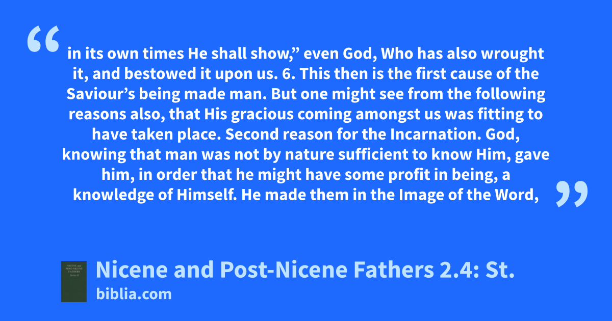 in its own times He shall show,” even God, Who has also wrought it, and bestowed it upon us. 6. This then is the first cause of the Saviour’s being made man. But one might see from the following reasons also, that His gracious coming amongst us was fitting to have taken place. Second reason for the Incarnation. God, knowing that man was not by nature sufficient to know Him, gave him, in order that he might have some profit in being, a knowledge of Himself. He made them in the Image of the Word,