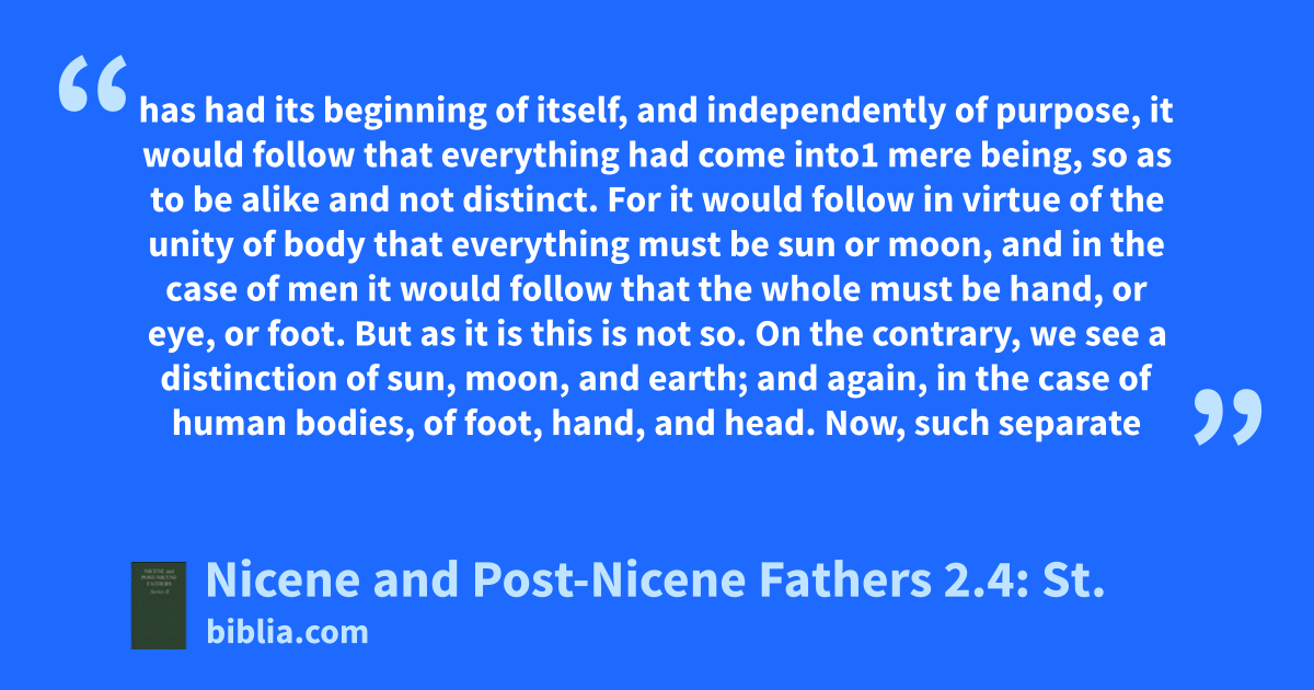 has had its beginning of itself, and independently of purpose, it would follow that everything had come into1 mere being, so as to be alike and not distinct. For it would follow in virtue of the unity of body that everything must be sun or moon, and in the case of men it would follow that the whole must be hand, or eye, or foot. But as it is this is not so. On the contrary, we see a distinction of sun, moon, and earth; and again, in the case of human bodies, of foot, hand, and head. Now, such separate