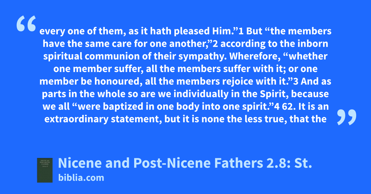 every one of them, as it hath pleased Him.”1 But “the members have the same care for one another,”2 according to the inborn spiritual communion of their sympathy. Wherefore, “whether one member suffer, all the members suffer with it; or one member be honoured, all the members rejoice with it.”3 And as parts in the whole so are we individually in the Spirit, because we all “were baptized in one body into one spirit.”4 62. It is an extraordinary statement, but it is none the less true, that the