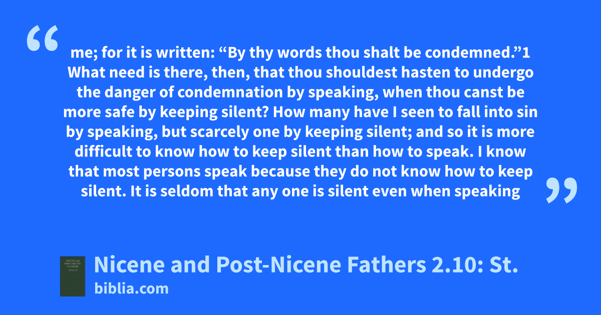 me; for it is written: “By thy words thou shalt be condemned.”1 What need is there, then, that thou shouldest hasten to undergo the danger of condemnation by speaking, when thou canst be more safe by keeping silent? How many have I seen to fall into sin by speaking, but scarcely one by keeping silent; and so it is more difficult to know how to keep silent than how to speak. I know that most persons speak because they do not know how to keep silent. It is seldom that any one is silent even when speaking