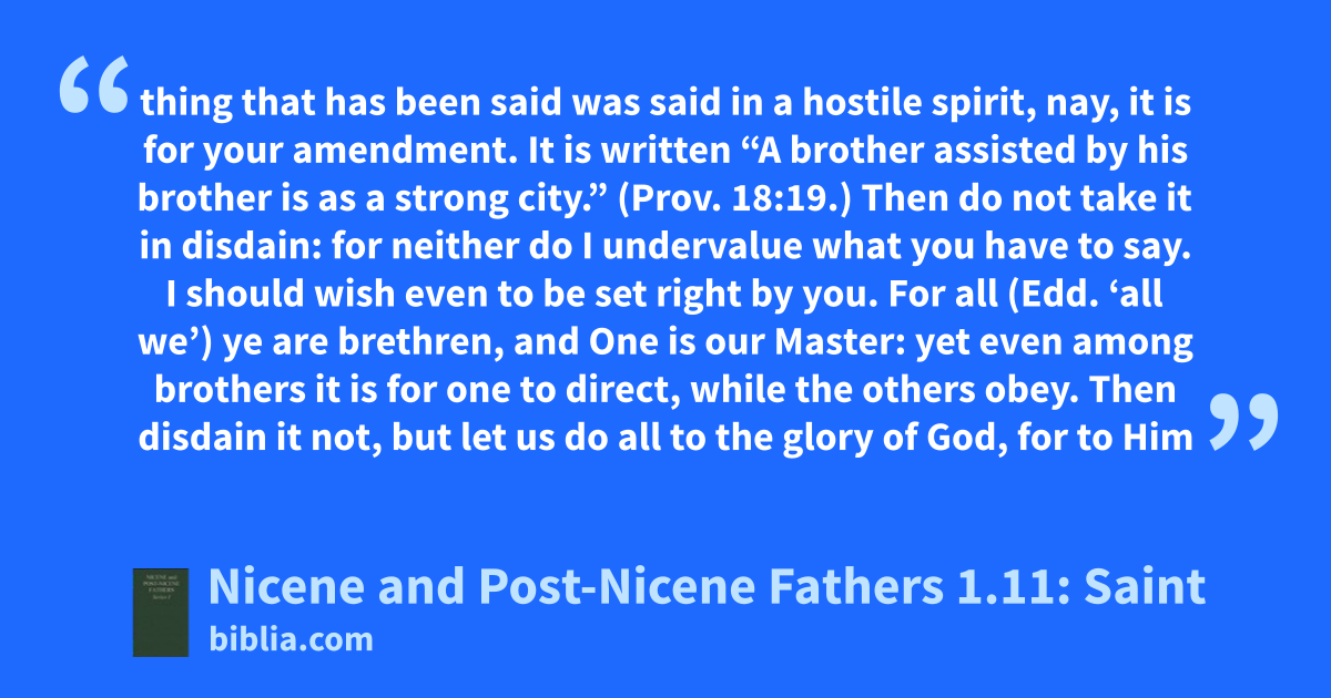thing that has been said was said in a hostile spirit, nay, it is for your amendment. It is written “A brother assisted by his brother is as a strong city.” (Prov. 18:19.) Then do not take it in disdain: for neither do I undervalue what you have to say. I should wish even to be set right by you. For all (Edd. ‘all we’) ye are brethren, and One is our Master: yet even among brothers it is for one to direct, while the others obey. Then disdain it not, but let us do all to the glory of God, for to Him