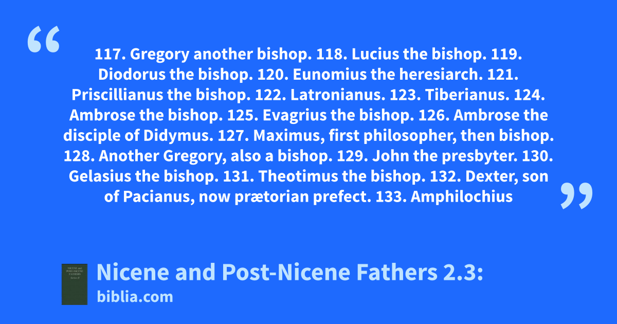 117. Gregory another bishop. 118. Lucius the bishop. 119. Diodorus the bishop. 120. Eunomius the heresiarch. 121. Priscillianus the bishop. 122. Latronianus. 123. Tiberianus. 124. Ambrose the bishop. 125. Evagrius the bishop. 126. Ambrose the disciple of Didymus. 127. Maximus, first philosopher, then bishop. 128. Another Gregory, also a bishop. 129. John the presbyter. 130. Gelasius the bishop. 131. Theotimus the bishop. 132. Dexter, son of Pacianus, now prætorian prefect. 133. Amphilochius