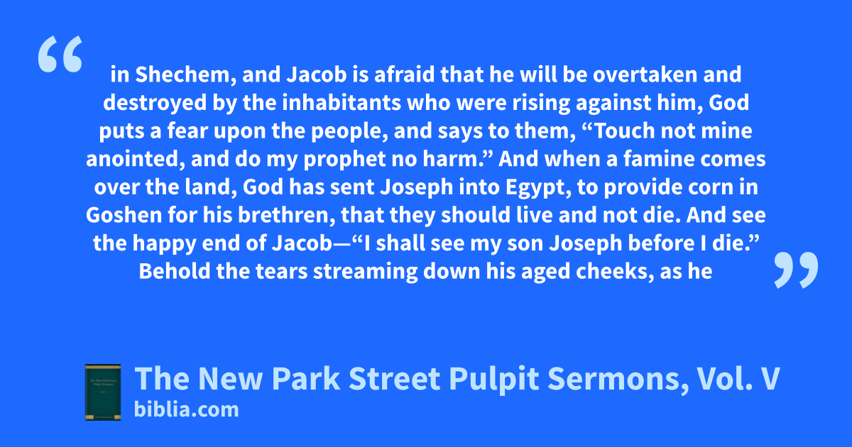 in Shechem, and Jacob is afraid that he will be overtaken and destroyed by the inhabitants who were rising against him, God puts a fear upon the people, and says to them, “Touch not mine anointed, and do my prophet no harm.” And when a famine comes over the land, God has sent Joseph into Egypt, to provide corn in Goshen for his brethren, that they should live and not die. And see the happy end of Jacob—“I shall see my son Joseph before I die.” Behold the tears streaming down his aged cheeks, as he