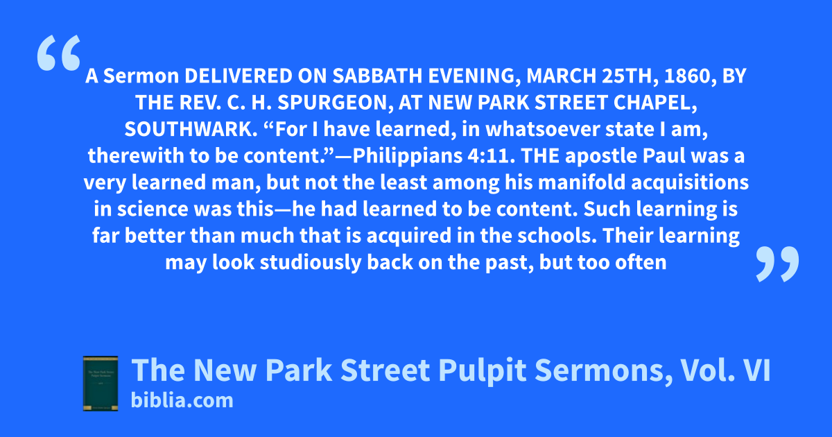 A Sermon DELIVERED ON SABBATH EVENING, MARCH 25TH, 1860, BY THE REV. C. H. SPURGEON, AT NEW PARK STREET CHAPEL, SOUTHWARK. “For I have learned, in whatsoever state I am, therewith to be content.”—Philippians 4:11. THE apostle Paul was a very learned man, but not the least among his manifold acquisitions in science was this—he had learned to be content. Such learning is far better than much that is acquired in the schools. Their learning may look studiously back on the past, but too often