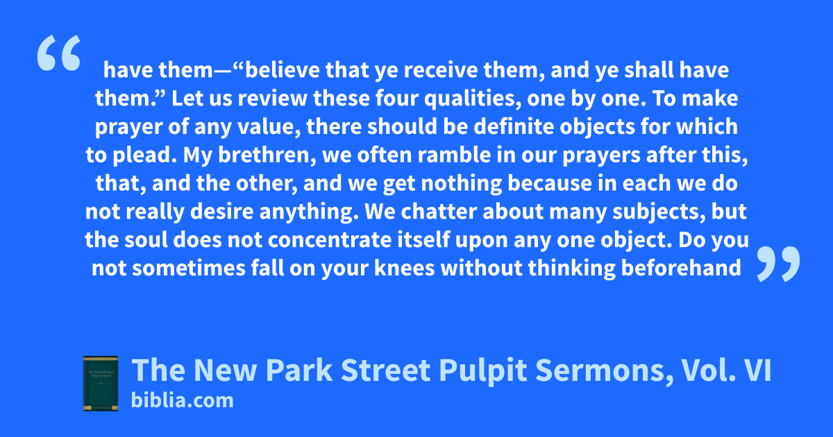 have them—“believe that ye receive them, and ye shall have them.” Let us review these four qualities, one by one. To make prayer of any value, there should be definite objects for which to plead. My brethren, we often ramble in our prayers after this, that, and the other, and we get nothing because in each we do not really desire anything. We chatter about many subjects, but the soul does not concentrate itself upon any one object. Do you not sometimes fall on your knees without thinking beforehand
