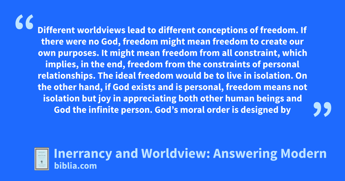 Different worldviews lead to different conceptions of freedom. If there were no God, freedom might mean freedom to create our own purposes. It might mean freedom from all constraint, which implies, in the end, freedom from the constraints of personal relationships. The ideal freedom would be to live in isolation. On the other hand, if God exists and is personal, freedom means not isolation but joy in appreciating both other human beings and God the infinite person. God’s moral order is designed by